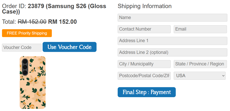 Final Step : Pay with credit card when you reach Paypal. Paypal is our credit card processor. Once payment is completed. We will produce and ship your custom Samsung S26 phone case. Delivery take will roughly 10 days.
